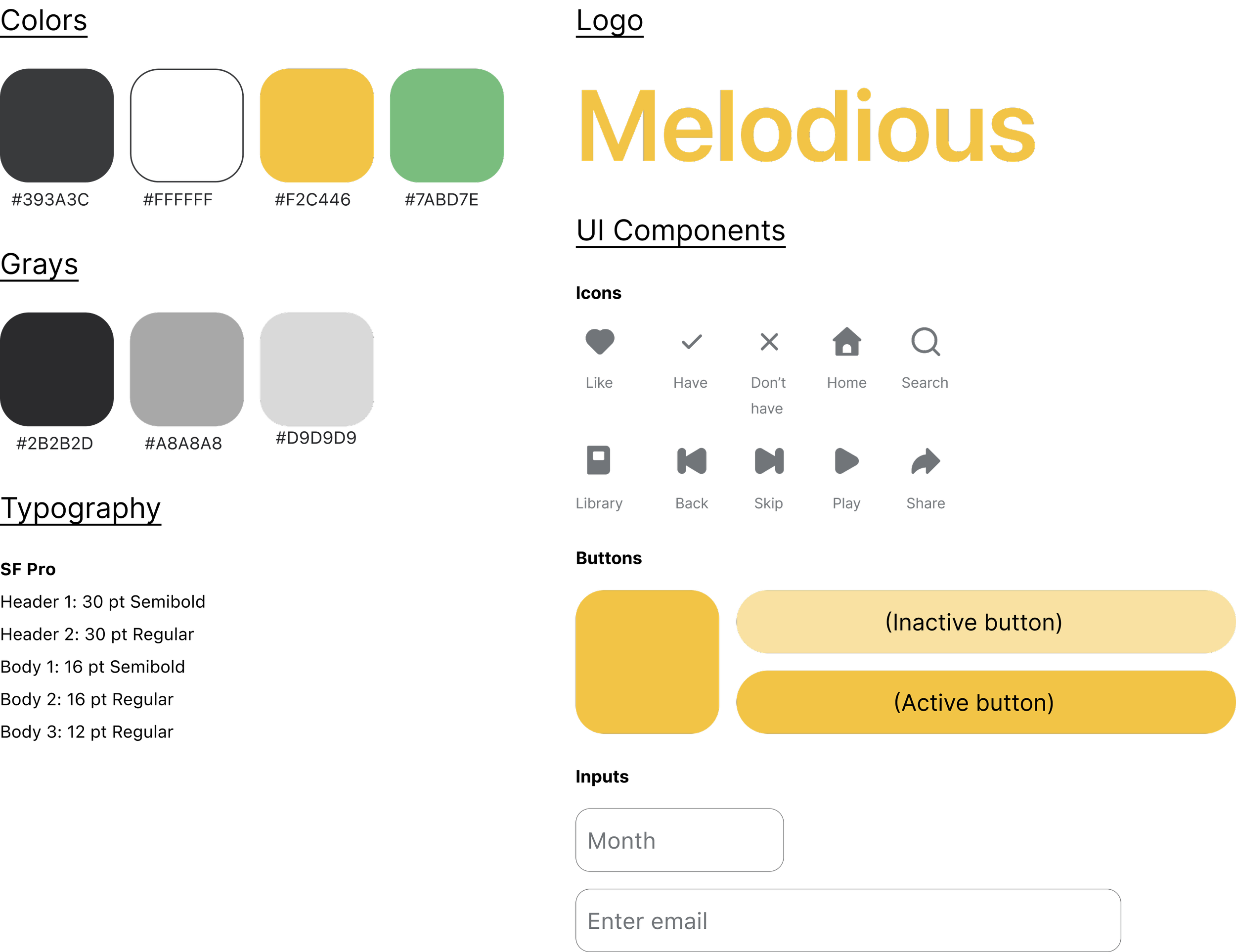 Now that I had a better understanding of the Melodious user I went on to create a style guide that I felt best represented the target users personality.